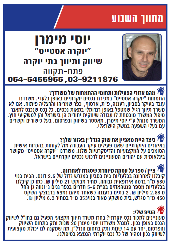 יוסי מימרן מ"יוקרה אסטייט" מתווך השבוע הארצי , בפעם השלישית ברציפות פורסם בלוח ידיעות אחרונות -